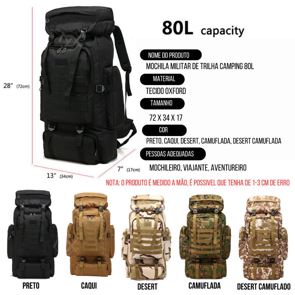 Descrição: Se você está procurando uma mochila de camping com muito espaço e qualidade de alto padrão, esse modelo vai lhe surpreender em todos os detalhes. Com capacidade de até 80L, possui várias divisórias e muitos bolsos para caber tudo que você precisa. Ideal para acampar, viagens, caminhadas, mochilão e outras atividades.